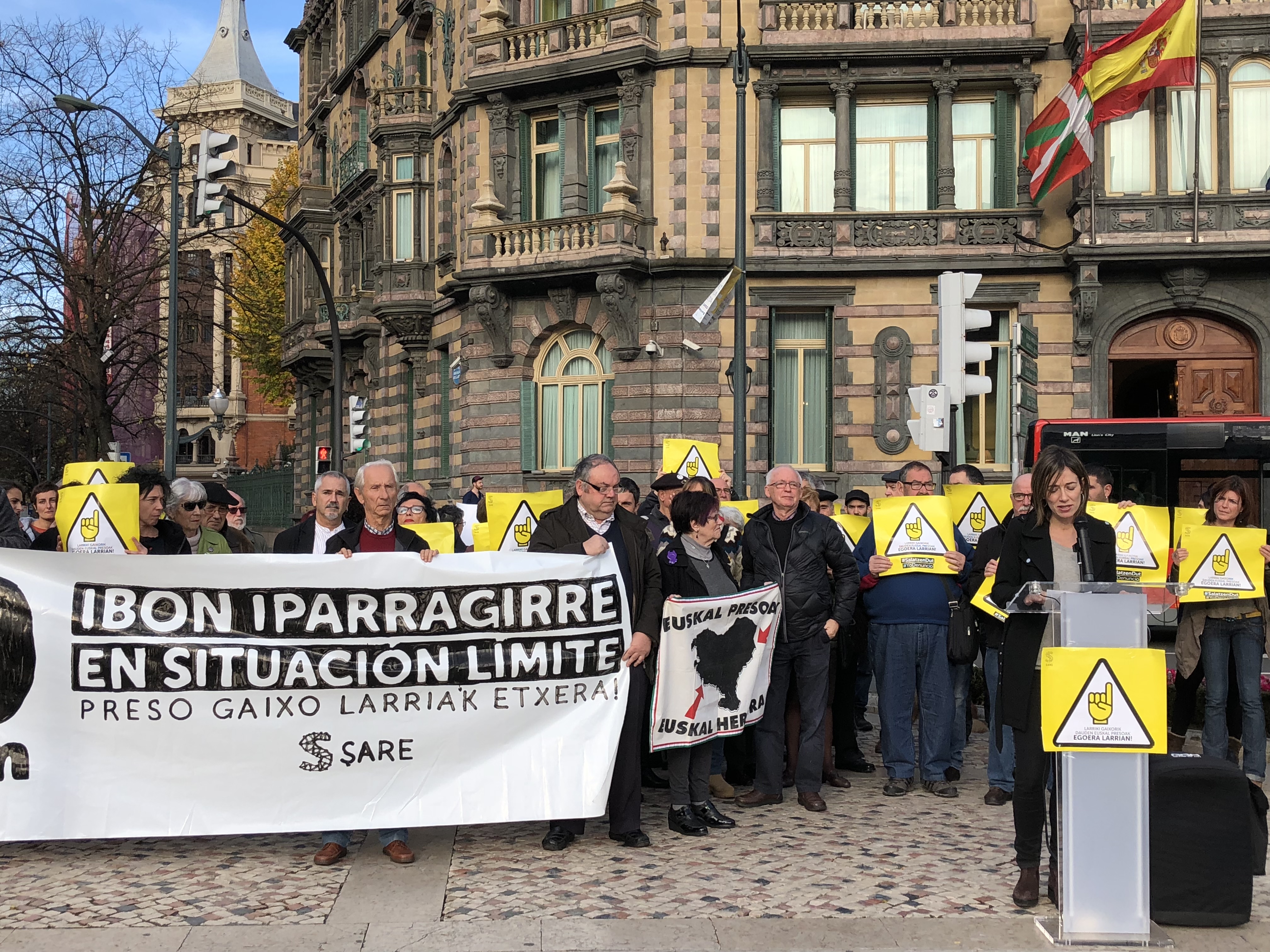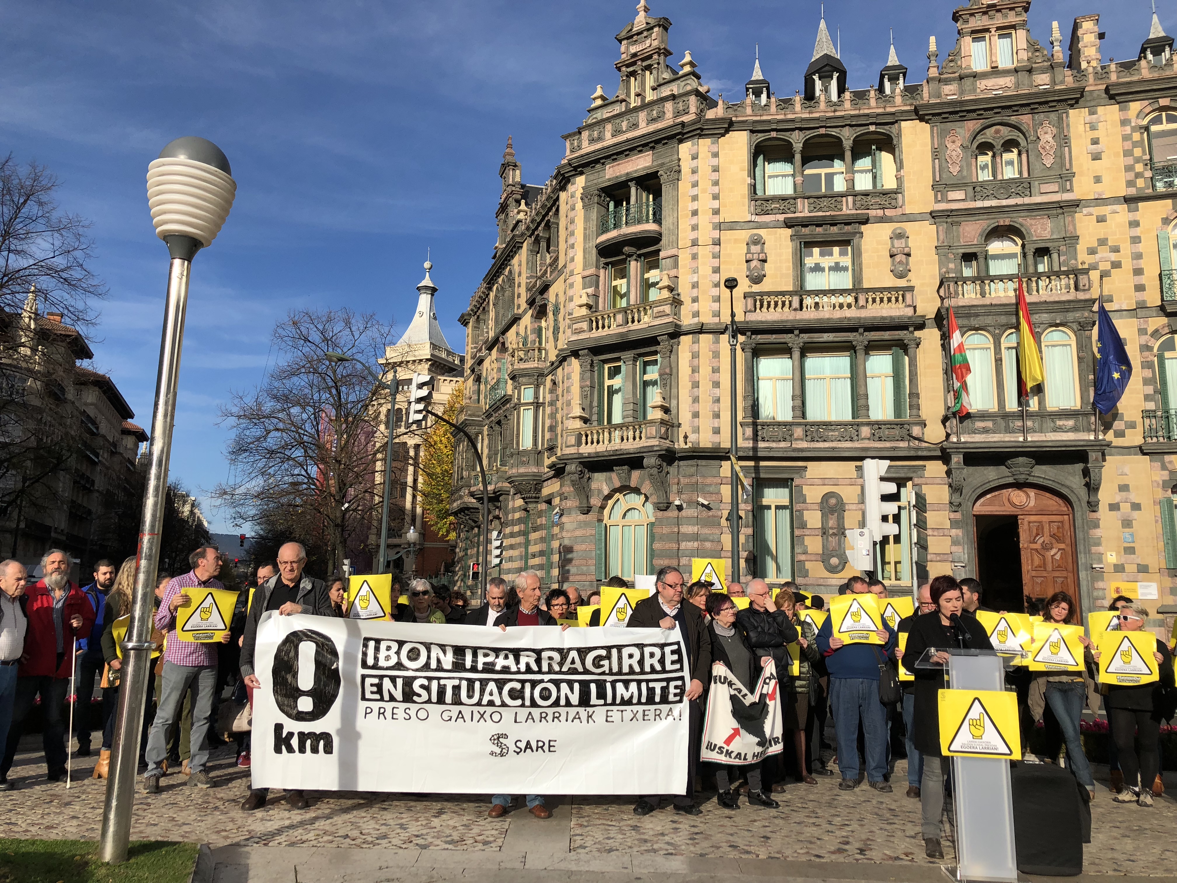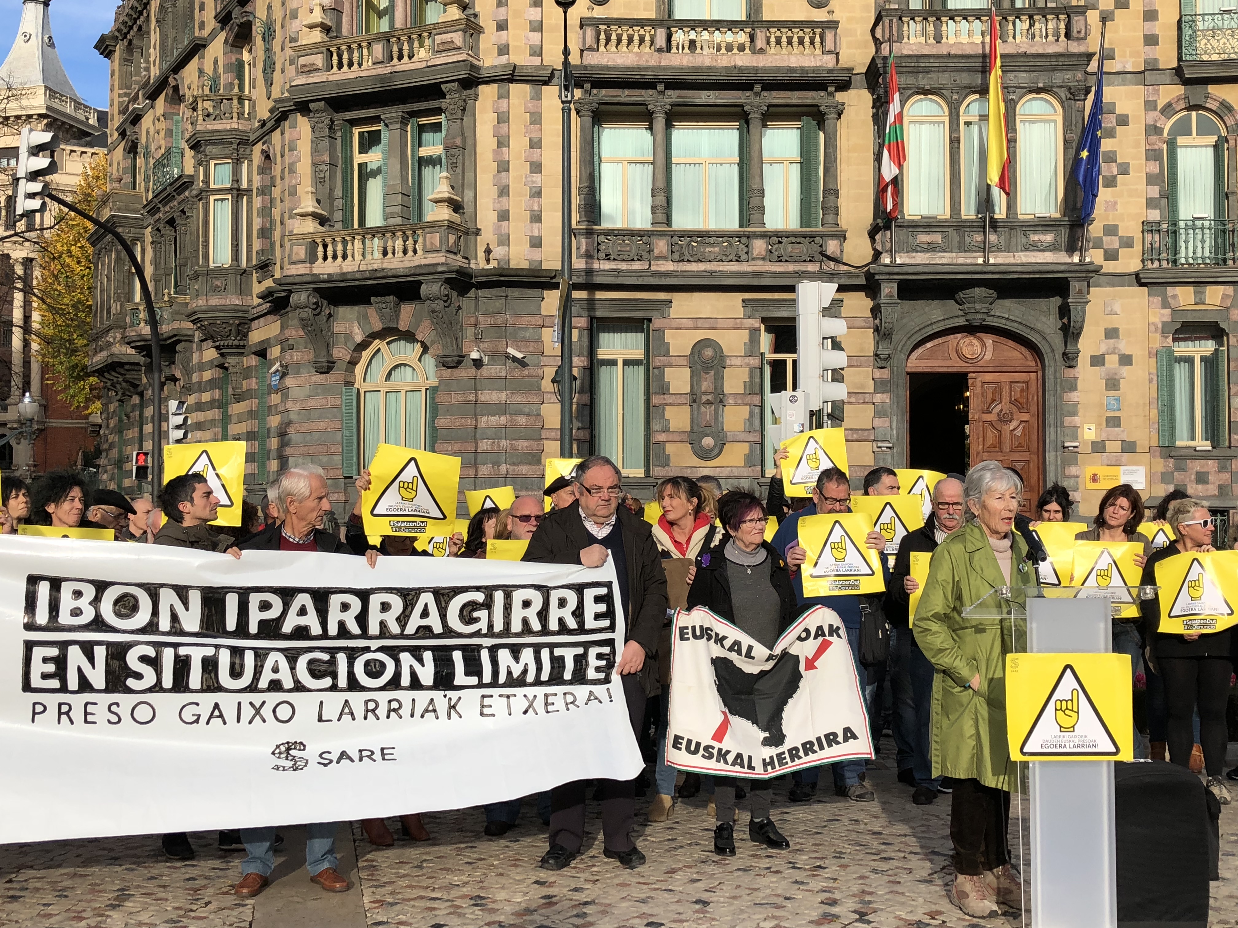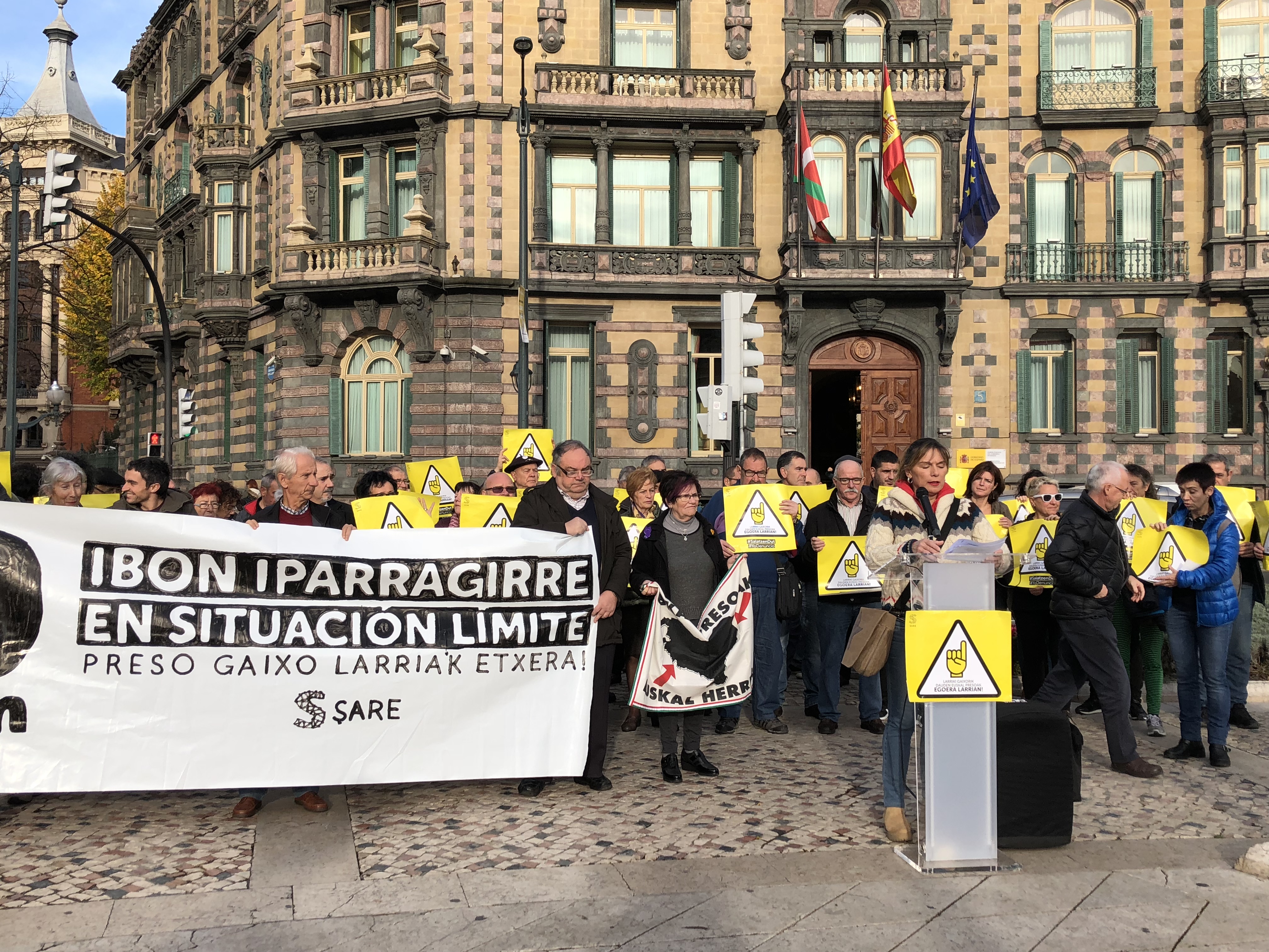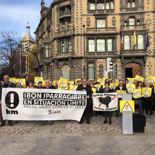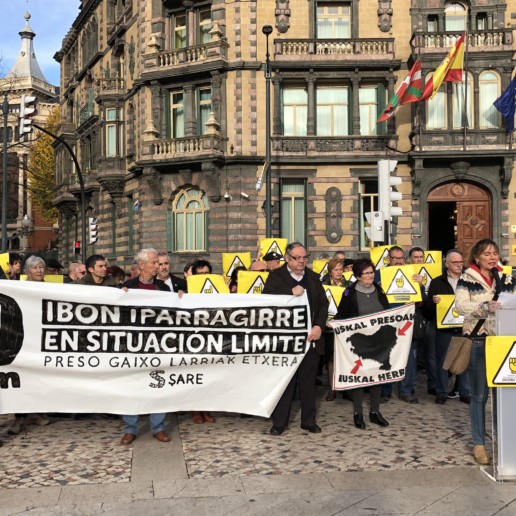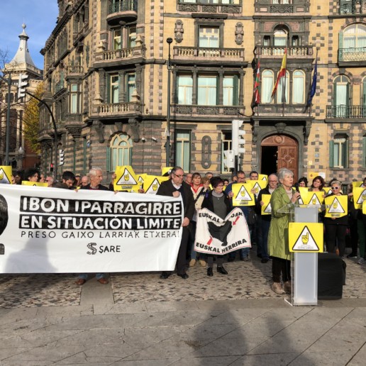 Sare ha convocado hoy una concentración frente a la Delegación del Gobierno para denunciar una vez más la, cada vez mas grave situación de Ibon Iparragirre y pedir su inmediata excarcelación. Junto a Sare, han participado en la concentración todos los sindicatos del ámbito laboral vasco (Etxalde, EHNE, ESK, Steilas, UGT, CCOO, LAB, ELA), junto a Etxerat, Iparra Galdu Baik y los familiares de Ibon. Las asociaciones y sindicatos han realizado sus aportaciones durante la concentración