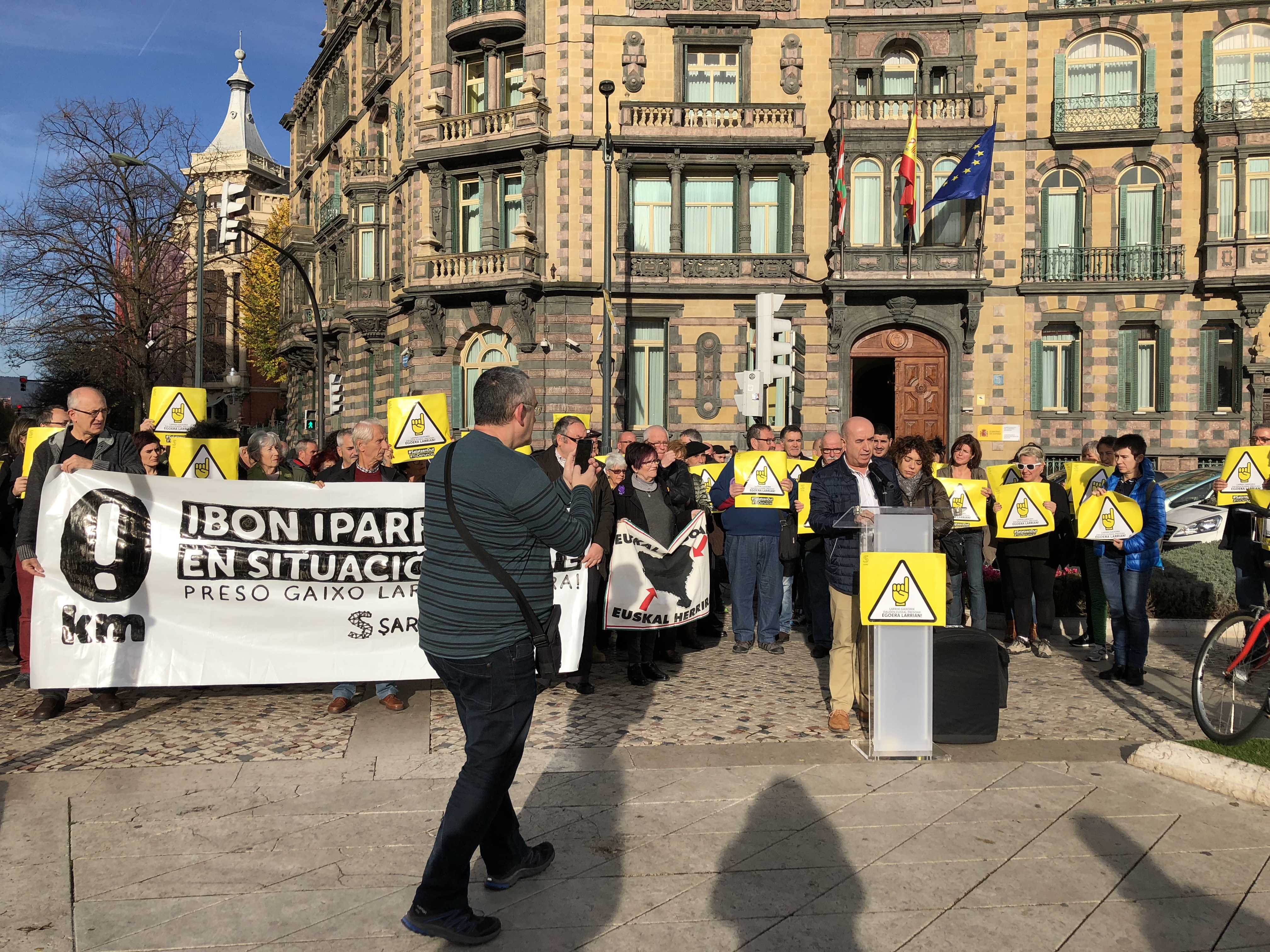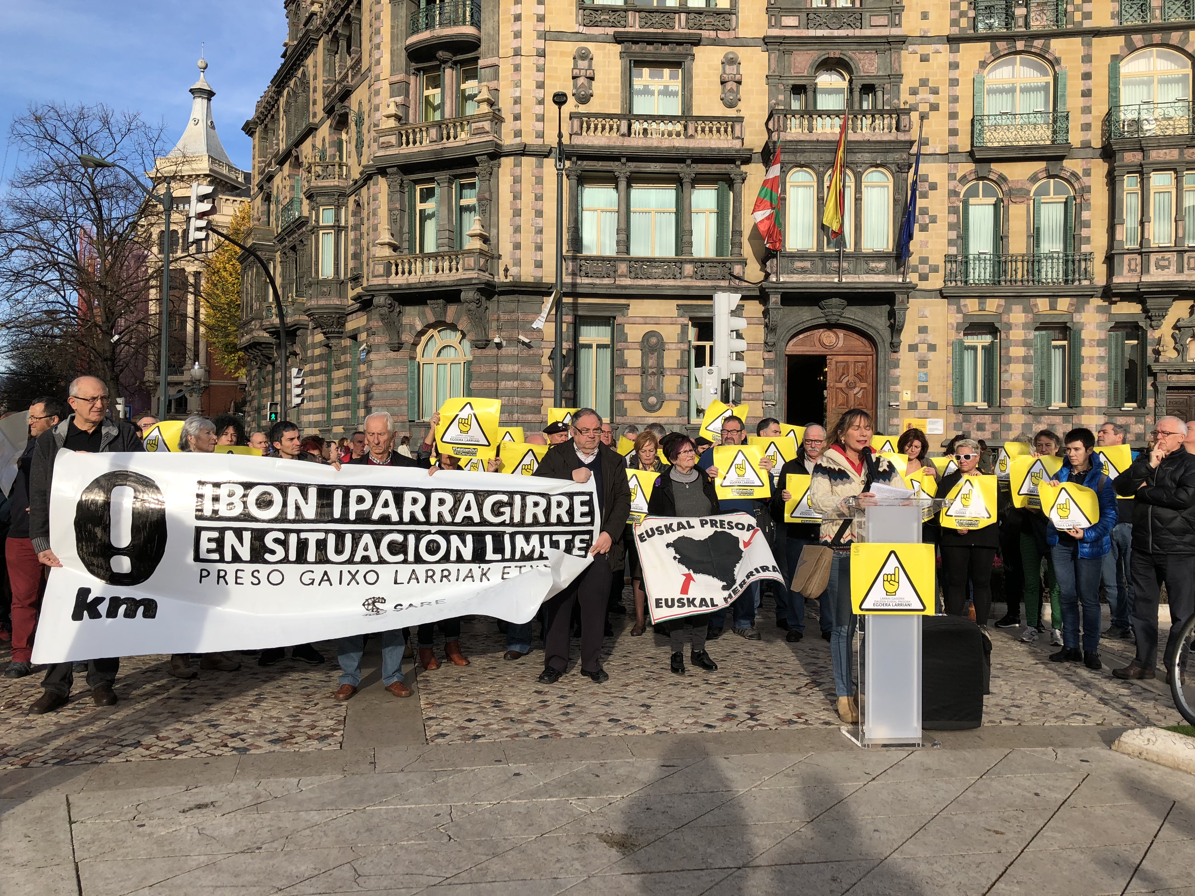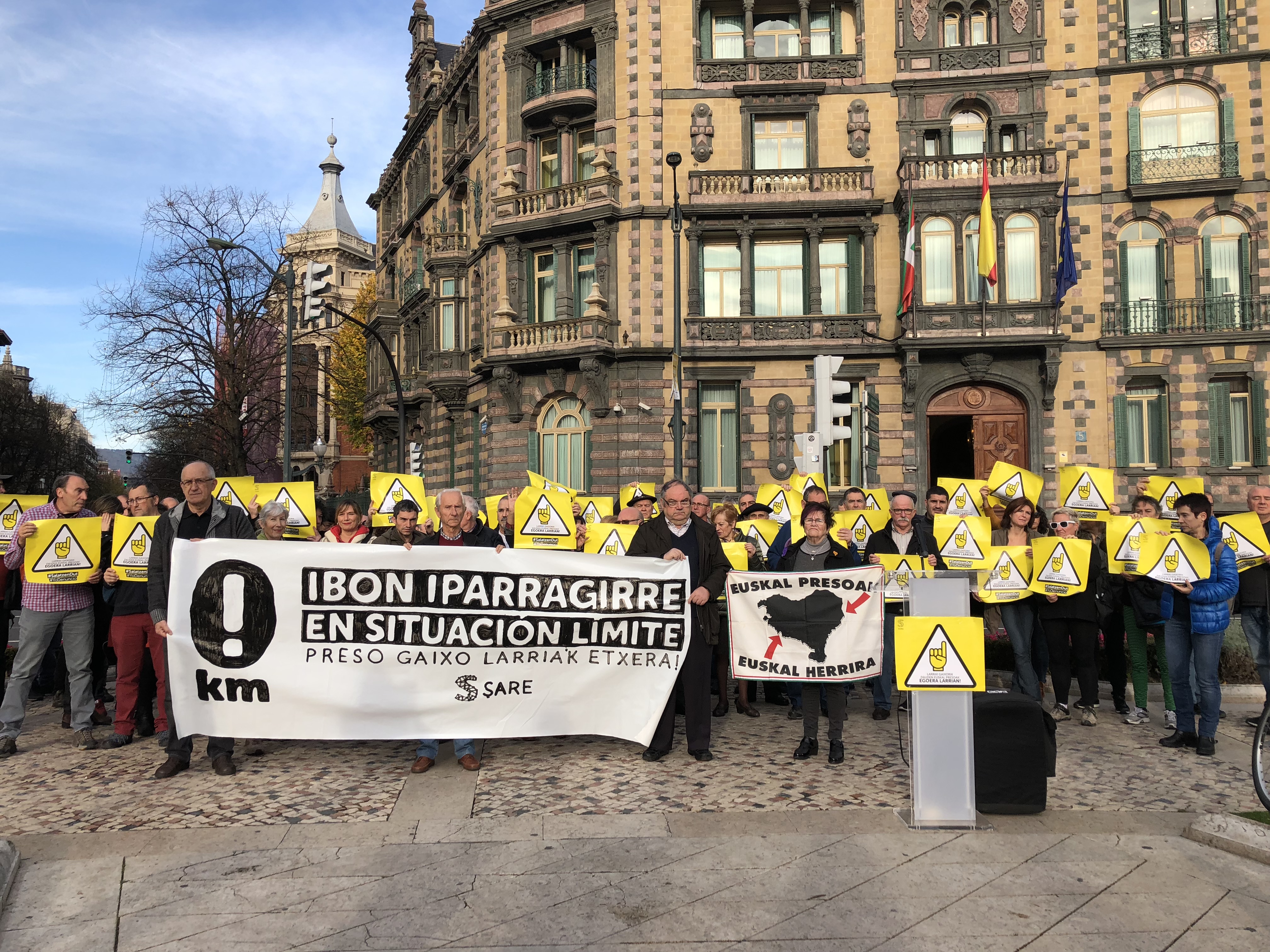 Representantes de los sindicatos ELA, LAB, CCOO, UGT, Steilas, ESK, Etxalde, EHNE e Hiru se han reunido hoy ante la Subdelegación del Gobierno español en Bilbo junto con integrantes de Sare, Etxerat y Iparra Galdu Baik para exigir la «inmediata excarcelación» de Ibon Iparragirre y otros presos gravemente enfermos.