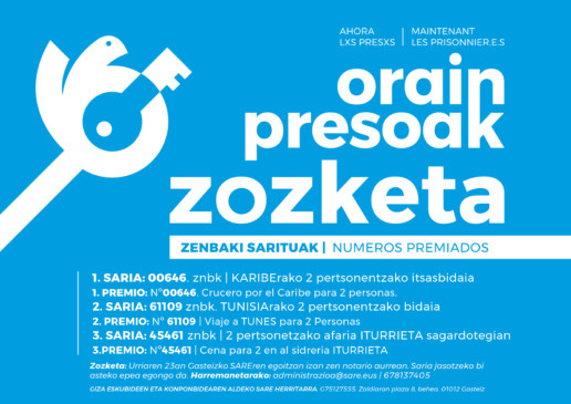 Milaka eta milaka bilduko gara Bilbon eta Baionan, Madril eta Parisi esateko bake justu eta iraunkor baten baldintzak ez direla oraindik bete. Esanen diegu prozesua ez dela bukatu gatazka armatuaren amaierarekin. Armagabetzea eta ETAren disoluzioaren ondotik, orain presoen aldia izan behar dela oihukatuko dugu!