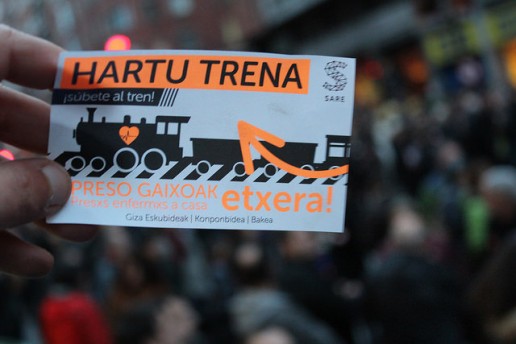Tras las multitudinarias manifestaciones del sábado en Bilbo y Baiona, Sare ha anunciado la puesta en marcha desde hoy mismo de una nueva dinámica encaminada a reunir «compromisos sectoriales» en defensa de los derechos de los presos y presas vascos. ‘Hartu trena. Súbete al tren de los derechos humanos’ es el lema de esta iniciativa, que plantea ir llenando pueblo a pueblo y barrio a barrio «vagones» de compromisos plurales y creativos, al tiempo que en Europa se pone en marcha otro vagón, en este caso cargado de argumentos jurídicos para denunciar en las instituciones europeas «la actividad política y jurídica» que el Estado español desarrolla sistemáticamente contra el colectivo de presos vascos.