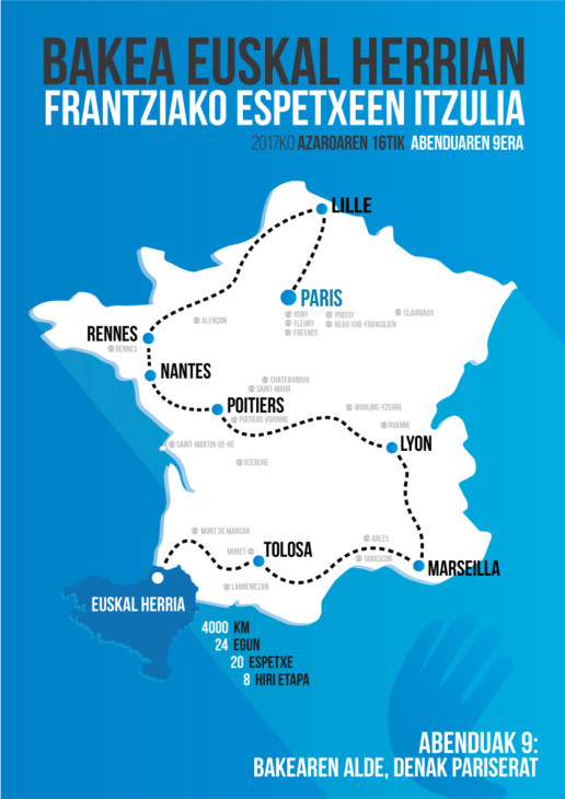La Gira comenzará en Mont de Marsan, acercándose a 20 cárceles en las que se encuentrar presos vascos, recorriendo en su marcha ocho ciudades del Estado francés: Toulouse, Marseille, Lyon, Poitiers, Nantes, Rennes, Lille y Paris. Estas ocho ciudades acogerán diferentes actos por parte de los organizadores y la Liga de los Derechos Humanos.
