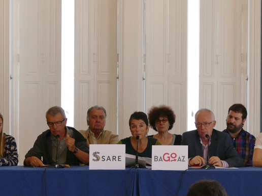 Teresa Toda y Joseba Azkarraga han desgranado las características de la red ciudadana, los ejes de su actividad, recorrido y los principales retos de cara a los próximos meses en la presentación pública llevada a cabo esta tarde en el Palacio del Condestable de Iruñea que se ha llenado para la ocasión. Uno de los principales temas expuestos ha sido la movilización convocada en Bilbo y Baiona por Sare y Bagoaz para reclamar el respeto de los derechos humanos de las personas presas, exiliadas y deportadas. En la presentación también hemos podido ver a representantes políticos y de los movimientos sociales de Iruñea.