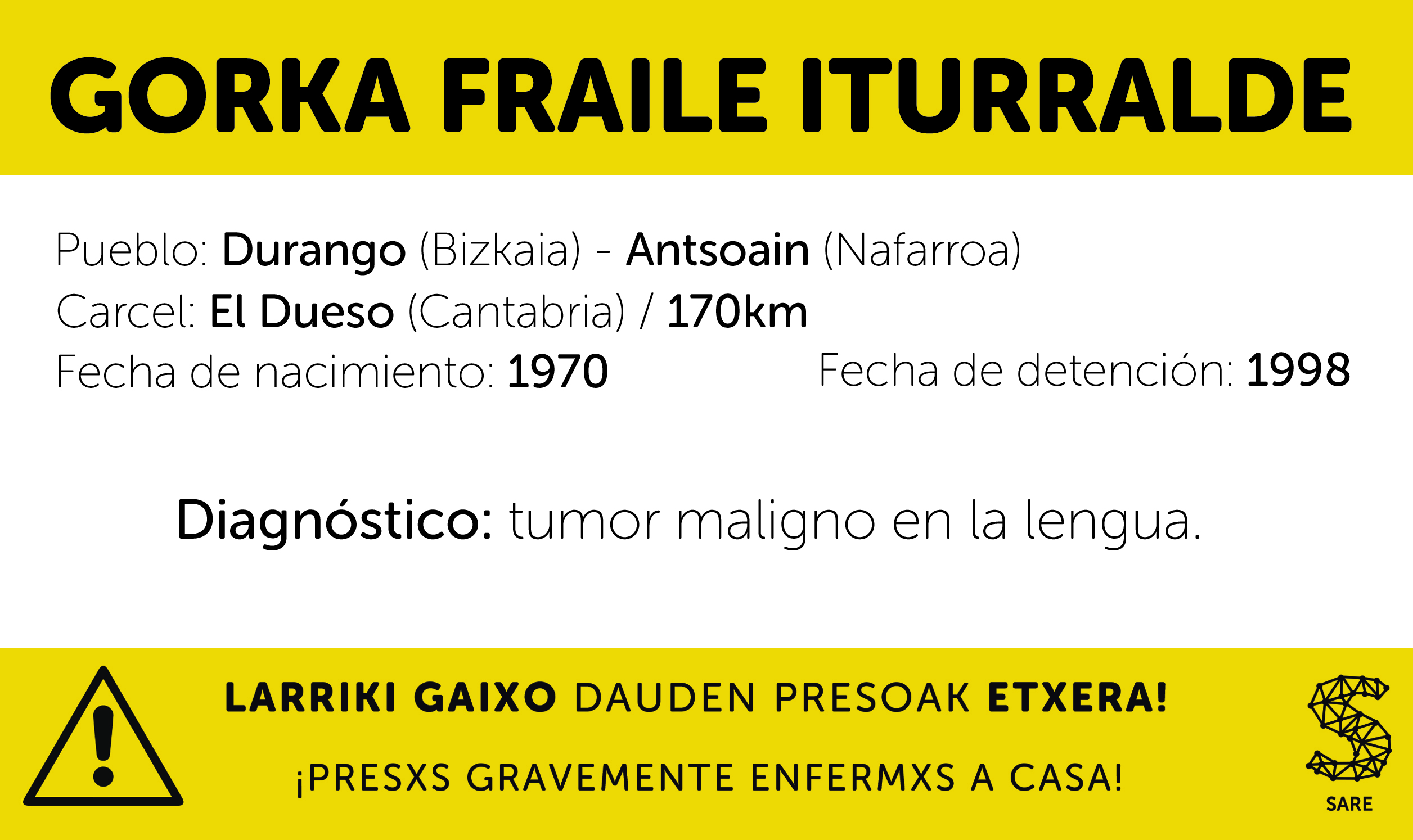 Por otro, queremos hacer referencia al permiso que el preso Gorka Fraile ha recibido para poder pasar tres días en casa, ya que lo valoramos de manera positiva y consideramos que puede ser un paso adelante. Aún así, Sare considera que los presos gravemente enfermos debes ser excarcelados, por lo que, seguiremos trabajando y reivindicando este derecho.