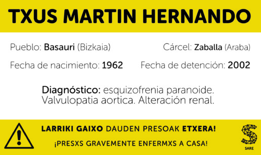 Txus Martin lleva años aquejado de una grave enfermedad, a la que, se le ha sumado una dolencia de corazón. Por esta nueva dolencia, Txus ha sido trasladado dos veces al hospital este último año. Esta última vez, para hacer frente a una operación del corazón por el que ha tenido que pasar varios días hospitalizado. Ante la grave situación de salud de Txus, desde Sare, no entendemos esta decisión de volver a encarcelar a Txus y pedimos, que como preso gravemente enfermo y ante la necesidad de recibir el mejor trato en las mejores condiciones, que Txus sea trasladado a su casa.