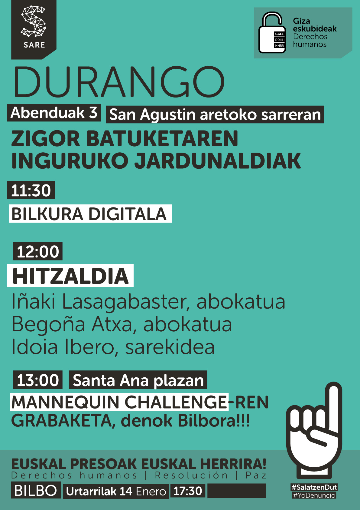 Abenduaren 3an, goizeko 11:30etatik aurrera Zigor batuketaren inguruko jardunaldiak burutuko ditugu Durangoko San Agustin aretoko sarreran.